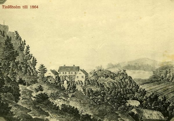 Vykort, "Tjolöholm till 1864". Motivet är en något beskuren version av en målning av Johanna Schultz från 1840. Egendomen hade då varit i släkten Svalin (även Swalin) sedan 1774 och manbyggnaden med sina symmetriskt placerade flyglar bär samma sekels arkitektur. Byggnaderna har två våningar med två skorstenar vardera på sadeltaken. Mellan flyglarna finns ett glest staket med centrerad portal och gårdsplanen mellan husen tycks vara fylld av träd. Havshorisonten syns i bakgrunden. Vid bergets fot ligger två enklare byggnader och bergskrönet pryds av en vimpel. Åt höger i bild breder odlingar och åkrar ut sig och i nedre hörnet av bilden ligger en ladugård i skiftesverk med stråtak, vilken syns i sin helhet på originalmålningen. Mangården ersattes av dåvarande ägaren Werner Santesson med en modern herrgård i nyrenässans som stod klar 1867.