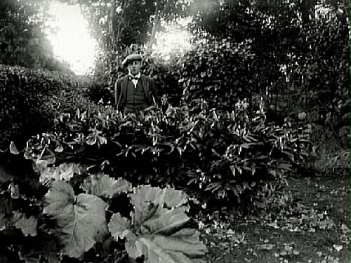 En man står bakom en låg buske i en frodig trädgård; i förgrunden rabarber.