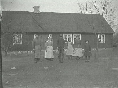 Fem personer på gårdsplan framför mangårdsbyggnad. Exteriörbild.