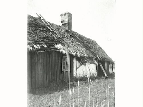 "Bålastuga med halmtak." I mitten skjuter ett putsat väggparti ut, troligen bakugn. Bålastugor (jfr gotländska "bulhus") byggdes med skiftesverksteknik. Denna har panelfasad.