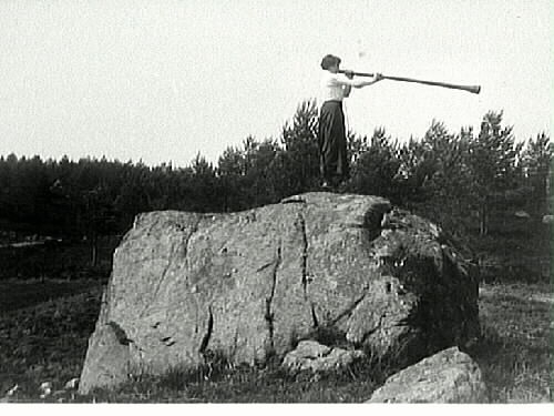 Kvinna som står på ett stenblock och tutar i näverlur från Dalarna.