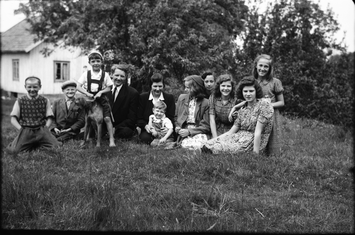 Elva personer ur olika generationer sitter i gräset med ett bostadshus i bakgrunden, sannolikt Sandlid. I mitten sitter Anna på Sandlid med sonen Leif i knät, den sönderna Ivar till vänster, Karl-Erik i "lederhosen" som låtsasrider på en hund och Almer längst till vänster. Till höger om honom sitter kamraten Erik på Heden. Bland flickorna till höger finns Annas döttrar Gunhild på knä och till vänster om henne Margit.