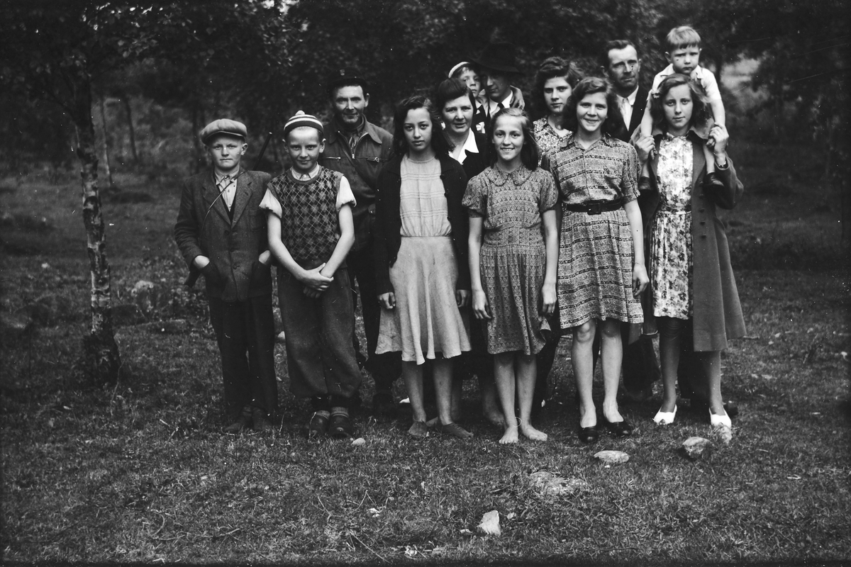 Här står fotografen Erik, trea från vänster, i en träddunge tillsammans med tolv personer ur olika generationer. Den äldre kvinnan i mitten heter Anna och är gift med Johan på Sandlid som står till höger. Mannen i hatt är sonen Ivar med sin lillebror Karl-Erik i famnen och pojken på axlarna är sonen Leif. Till vänster om Kloar-Erik står deras son Almer och längst till vänster Erik på Heden med ett gevär på ryggen. Flickorna nr 2 och 3 från höger är döttrarna Margit och Gunhild. Familjen flyttade kort efter fotot till Idala. Övriga är ej namngivna.