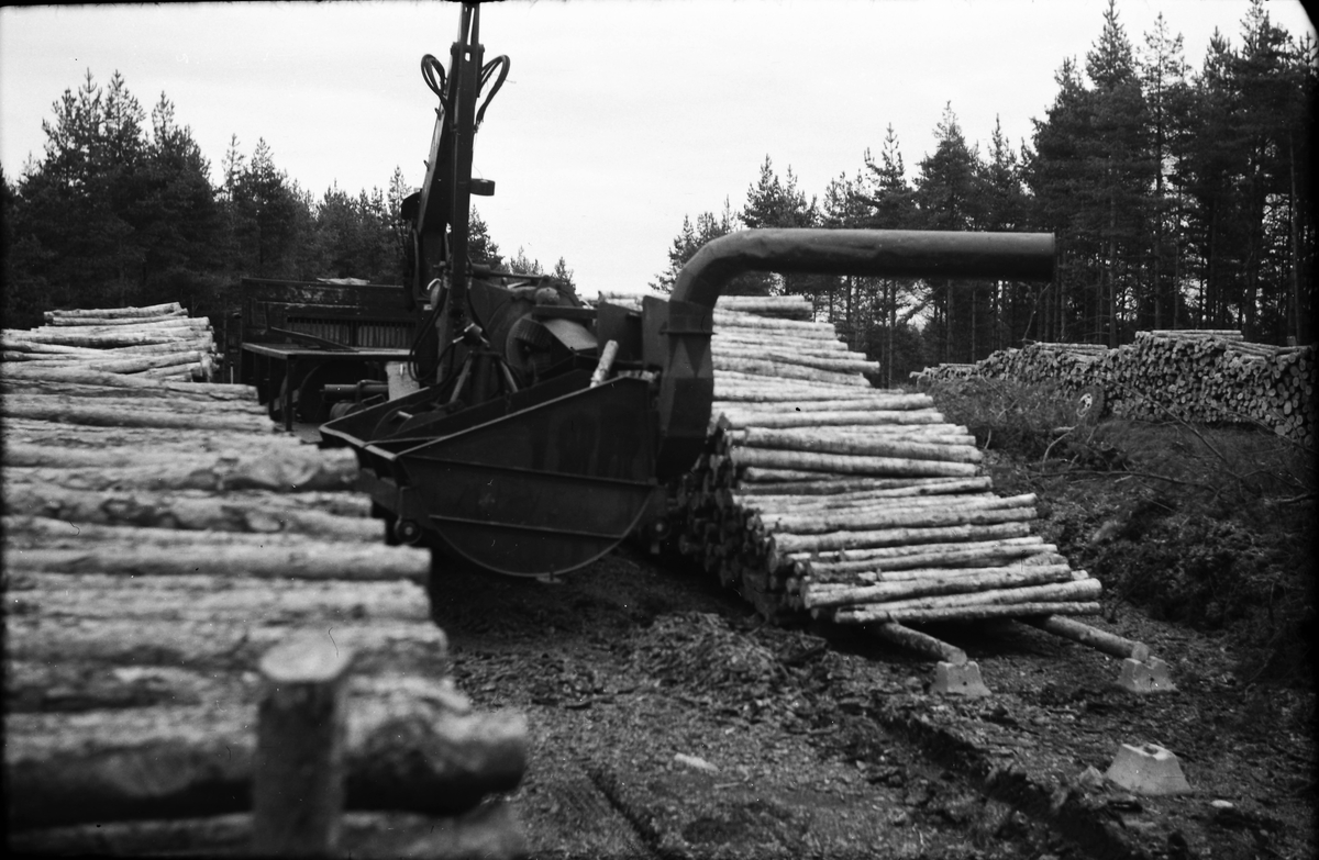 Barkningsmaskin bland upplag av stockar i barrskog. (Se även bild EA1223)