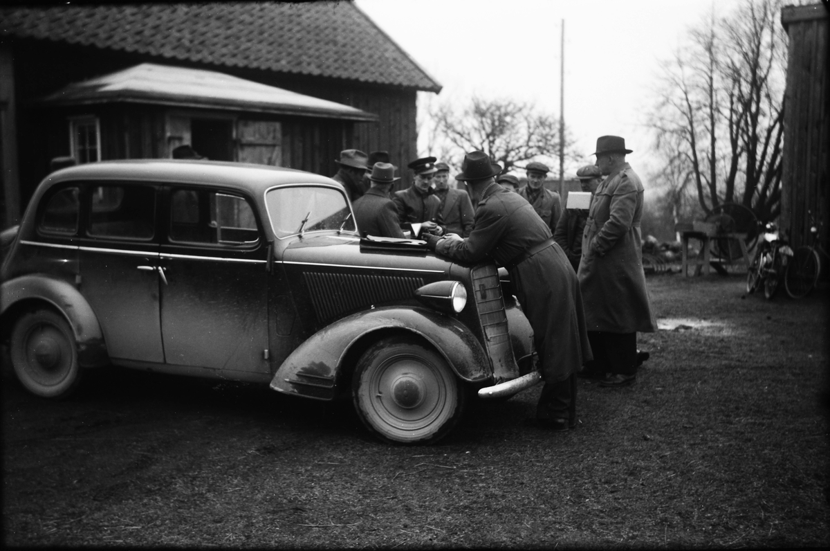 En grupp män står samlade vid en bil, "droska", runt en man i skinnjacka och uniformsmössa (se även bild EA1256). Hälften av männen är klädda i hatt och trenchcoat och övriga i kavaj och keps.