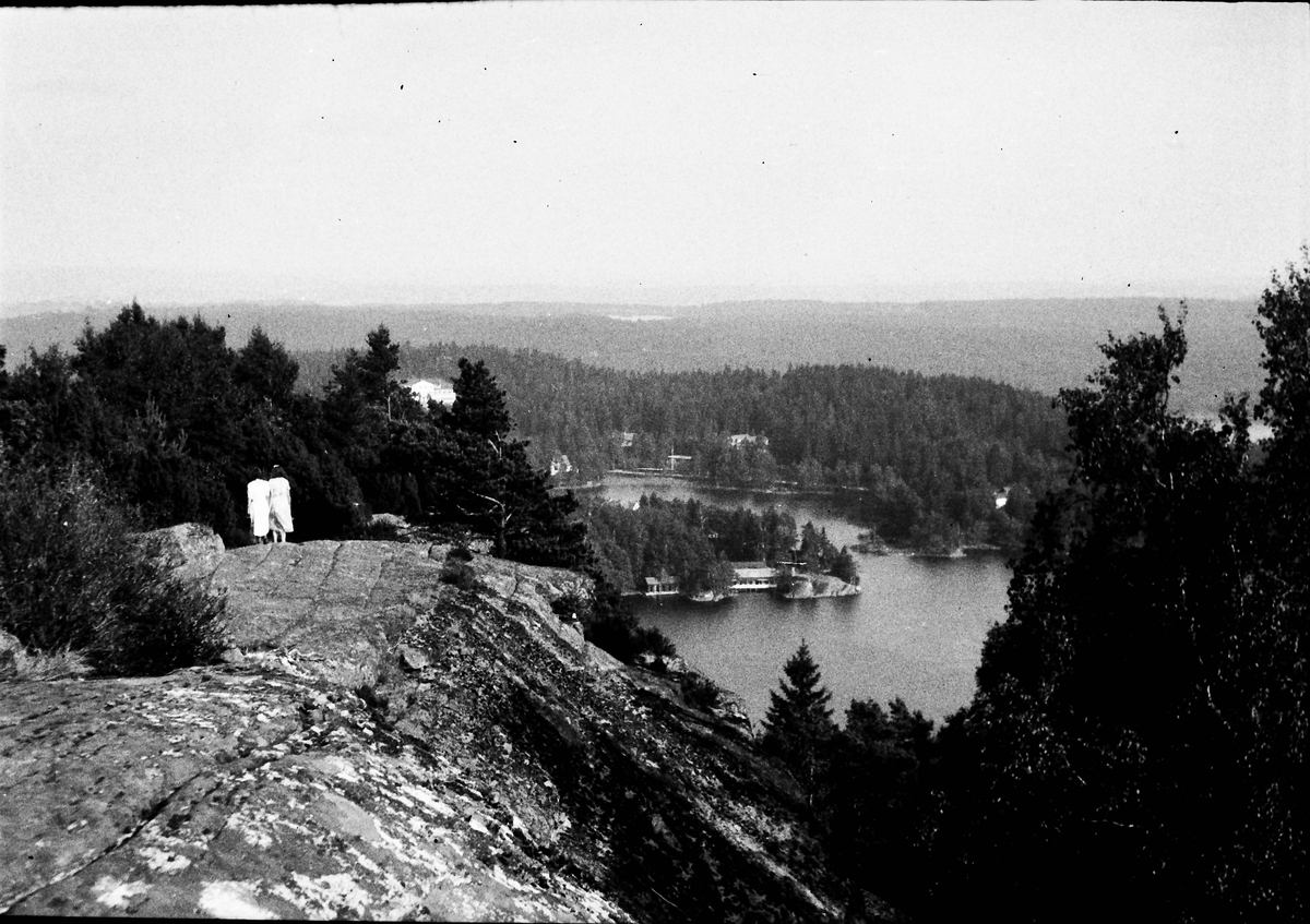 Vy över Helsjön (Hällesjö) och Helsjöns folkhögskola från ett högt berg, högst sannolikt Texelberget (Täxleberg). Två vitklädda kvinnor vandrar längs bergskanten. Till höger skymtar även Stora Hornsjön. På Texelbergets högsta spets (180 m ö h) finns råmärket mellan Halland och Västergötland. På udden