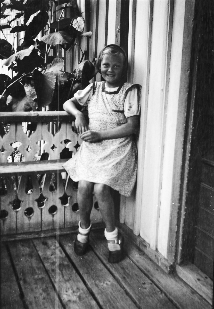 En liten flicka sitter på Lines verandabänk med ett stort bladverk bakom sig. Räcket är vackert figursågat. (Se även bildnr EA1286)