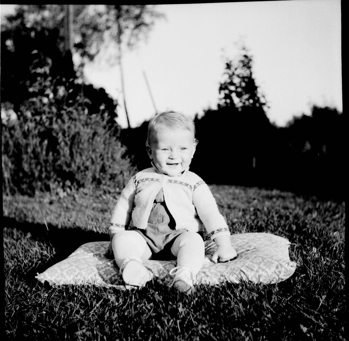 Lilla pojken Roy sitter på en dyna i gräset. Han har kofta, strumpor och skor till sin byxdress.