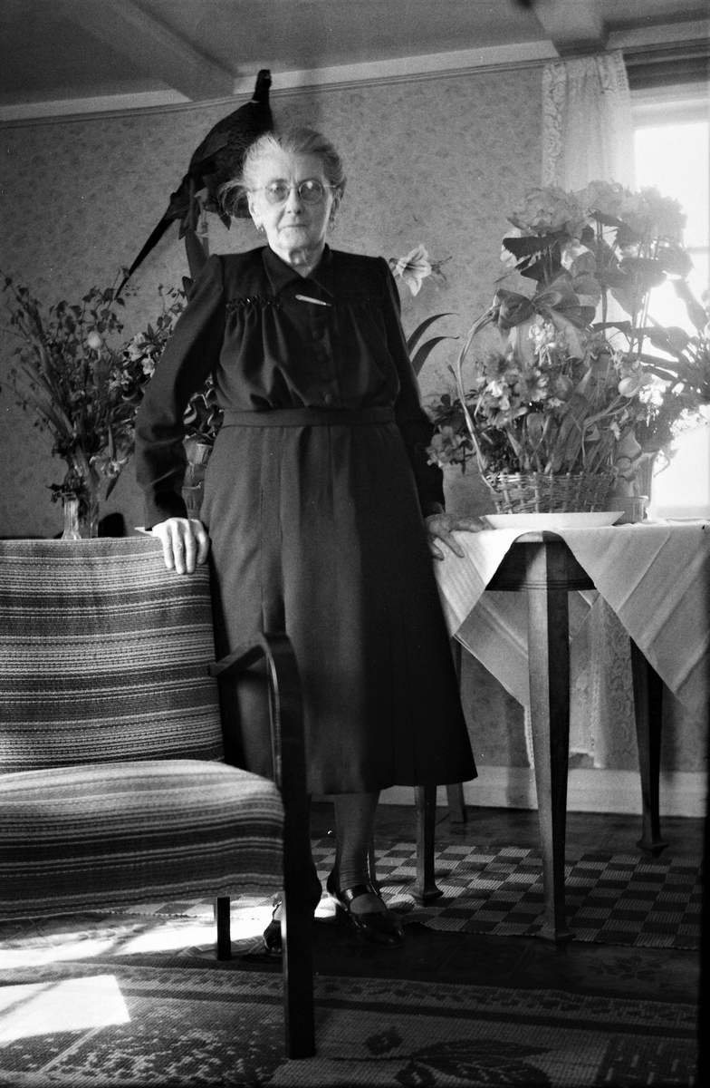 En äldre dam poserar vid ett bord med blomsteruppsättningar som förmodligen förärats henne på någon bemärkelsedag. På väggen bakom henne sitter en uppstoppad fasan.