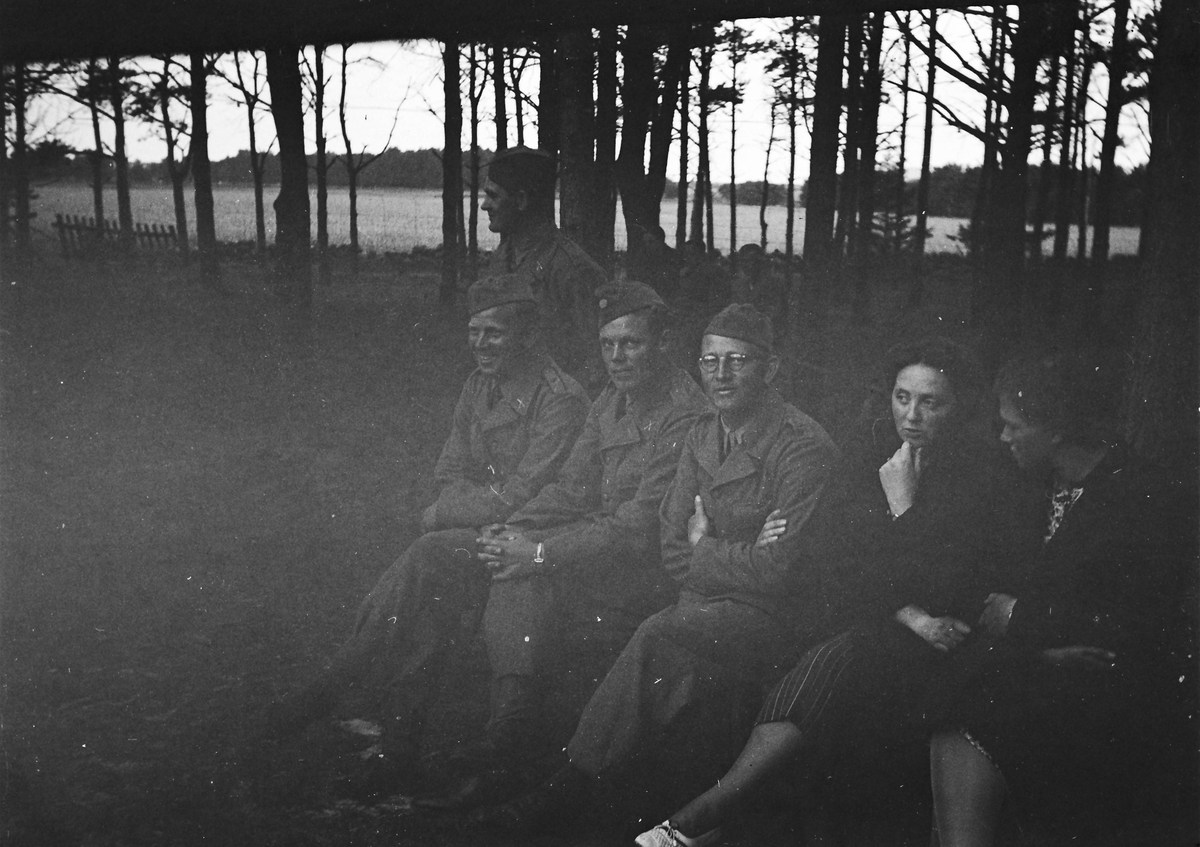 Några beredskapsmän och två kvinnor, kanske "lottor", sitter i en skogsdunge med ett öppet fält i bakgrunden, mörkret antyder att det är i skymningen.