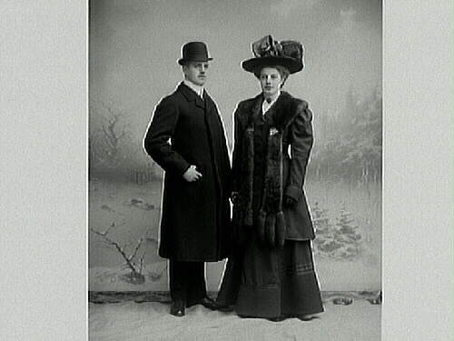 Ateljébild. Bakgrunden föresäller ett vinterlandskap. Herr och fröken Johansson bär ytterkläder. Syskonbild.