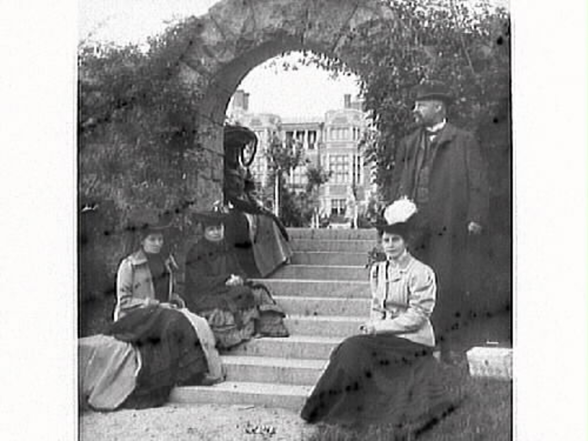 Fotograf Mathilda Ranch besöker Tjolöholms slott 1906 och ses här sitta bakom portalen. Systern Hulda Lindh sitter längst till vänster. Slottet var nyligen färdigställt (1904) men ägarinnan Blanche Dickson dog oväntat den 21 maj 1906.