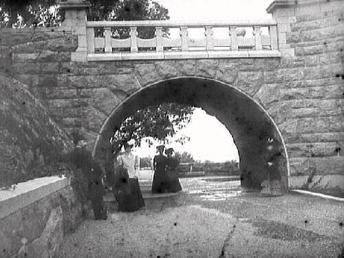 Fem personer står i valvet på östra sidan av Tjolöholms slott, det har regnat. Vyn är åt havet. Mathilda Ranch besöker Tjolöholms slott med systern Hulda med flera. Ovanpå valvet ligger terrassen utanför Blanches salong.