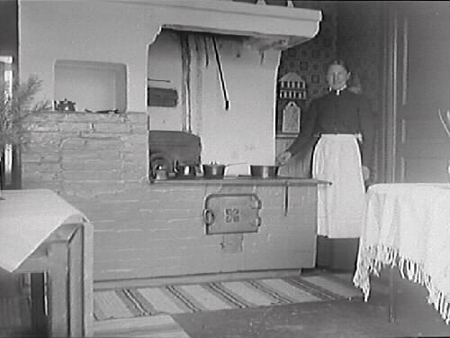 Spisgruvan i köket hos Maria Elmgren, kv Magistern, Prästgatan, med hennes jungfru stående vid spisen. Tallris och hyacint på borden antyder att bilden är tagen kring jul.