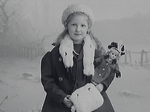 Porträtt av fotografens systerdotter Ingrid Alling med en docka. Hon är vinterklädd med pälsboa och -muff.