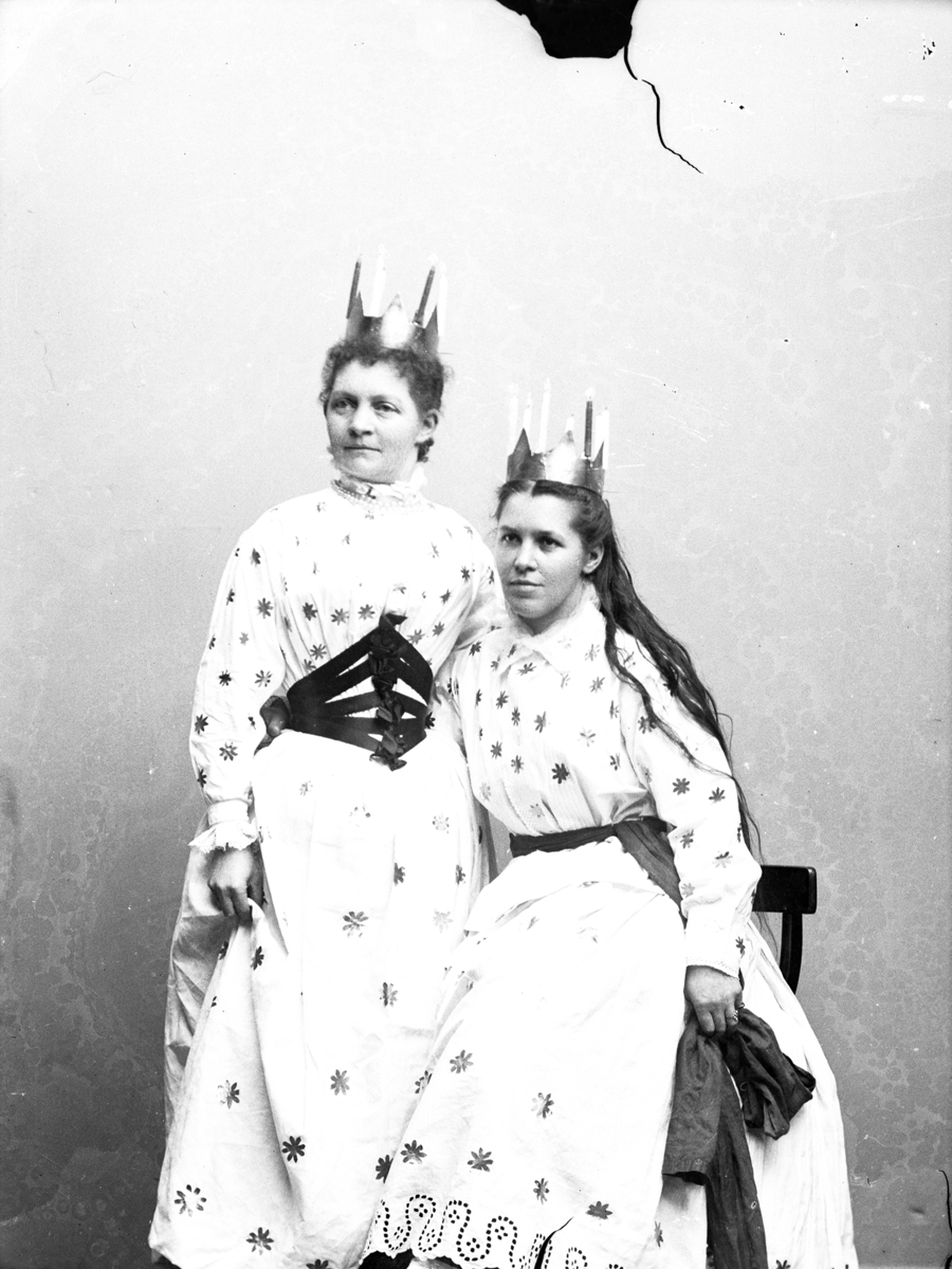 Mathilda Ranch (sittande) och väninnan Hermine Carlsson från Göteborg som Lucior 1897. Mathilda har utslaget år, båda bär kronor av tunn plåt med smala ljus, snarlika stjärnbeströdda klänningar men olika skärp.