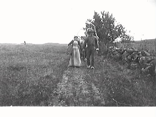 Slåtterfolk på väg hem från slåttern nedför fältet längs en stengärdsgård.