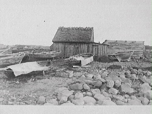 Fiskebod och flera båtar på en stenig halländsk strand.