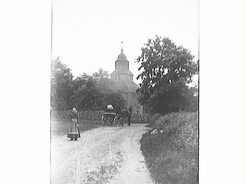 En hästskjuts är på väg mot Okome gamla kyrka och i förgrunden står en kvinna med randigt förkläde vänd mot fotografen. Okome nya kyrka uppfördes 1891.