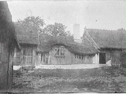 Vy över kullerstenssatt gårdstun mot en högloftsstuga, där taket till ryggåsstugan i mitten är mjukt svängt över ett centrerat fönster.