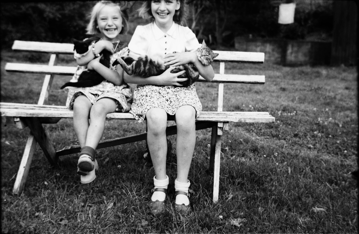 Två flickor gosar med var sin katt på en trädgårdsbänk.
