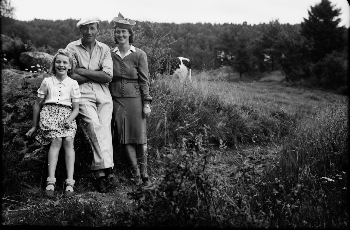 Paret Hellström med dotter vid en bergknalle i kohagen. Frun är klädd i en konstifik hatt och dräkt med klädda knappar och borderi på jackfickorna.