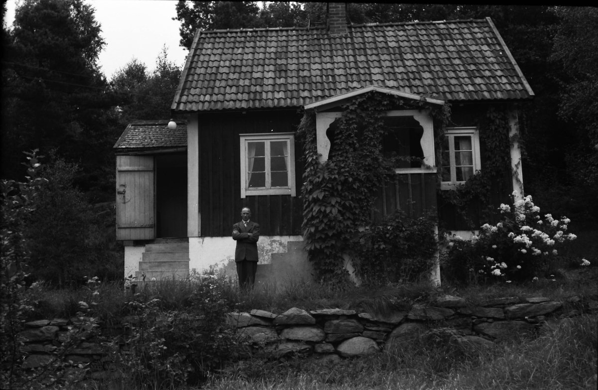 Johan Ekholm står utanför sin stuga, Kullagård. Mitt på fasaden finns en öppen veranda inklädd i växtlighet och vid ena stugknuten blommar en vit flox. Trappan till verandan har tagits bort och ersatts med en farstu på ena gaveln. Framför huset ligger en stenmur.