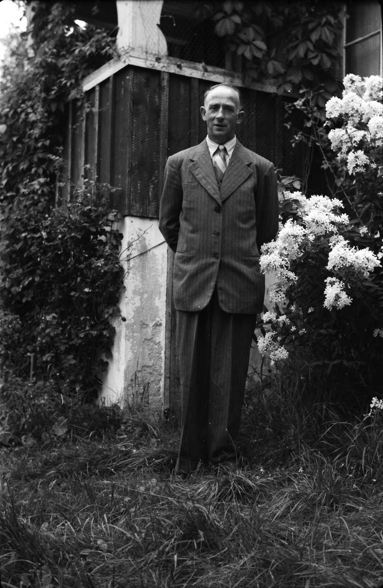 Johan står vid farstukvisten till sin stuga vid en högväxt vit flox.