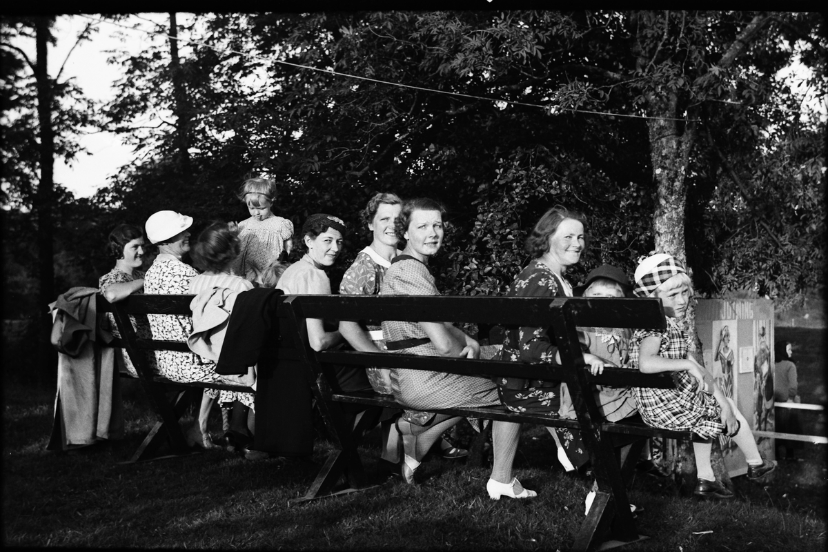 Kvinnor och barn sitter på en bänk i en träddunge på en höjd över en prickskyttebana på en festplats.