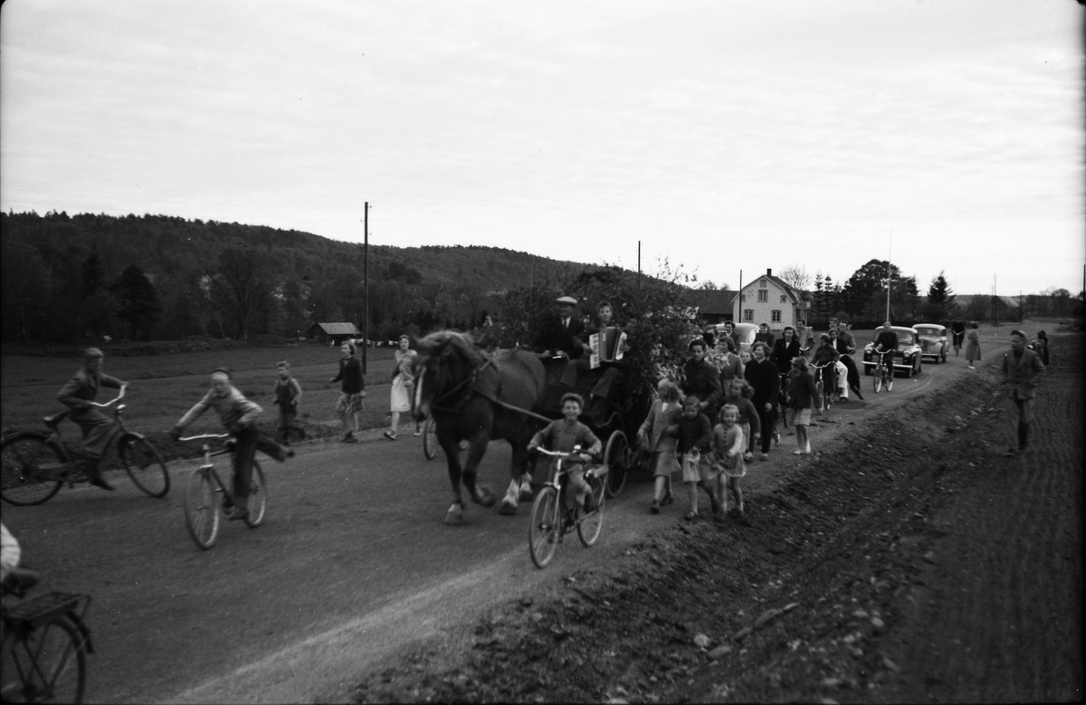Kortege på landsvägen med lövad vagn och dragspelare. Kusken heter Ingemar Sjögren och enligt uppgift tilldrar sig händelsen "vid flytt av Sjuttas vid Strängbetong". Många cyklar och i bakgrunden syns även några bilar.