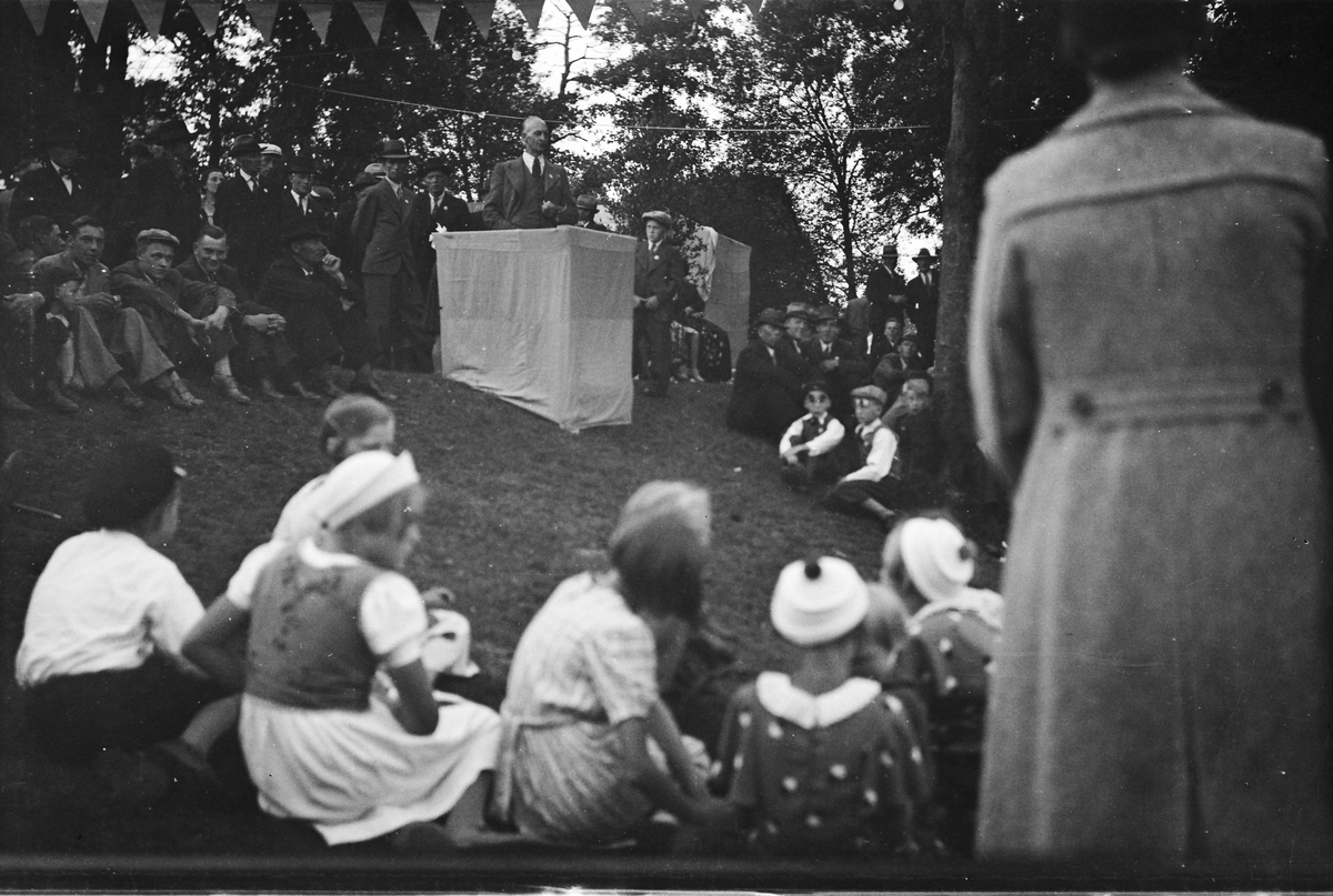 Kommunalpolitikern och folkskolläraren Oscar Broborg talar på festplatsen i Kalvhult, Veddige. Han anlade i Fullsbäcken även en botanisk trädgård och "plats för gammal allmogekultur" som han kallade det.