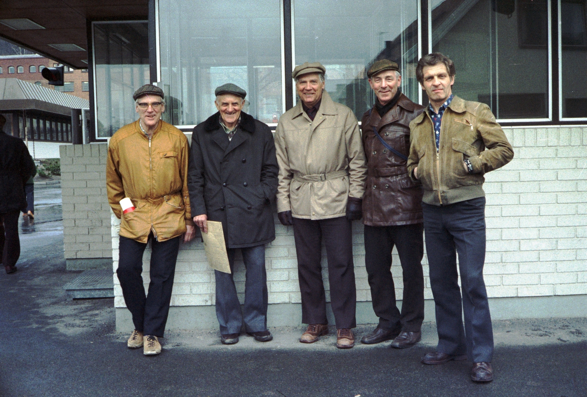 Fem män vid ett hus i Huskvarna. Från vänster: Erland Johansson (1), Harry Holmström (2), Lennart Tivelius (3), Nils Skarp (4) och Uno Gustavsson (5).