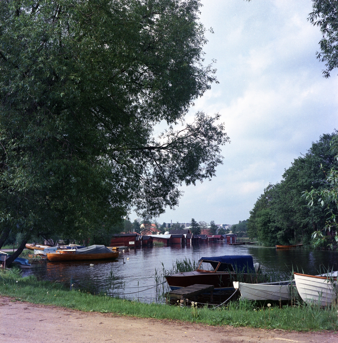 Båtar och båthus vid Huskvarnaån. I bakgrunden syns Österängen.