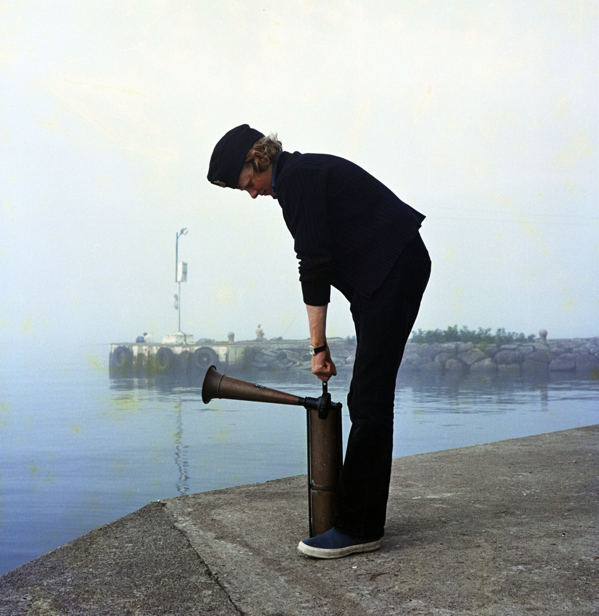 En man med en mistlur, "Tyfon", från 1900-talets första hälft, signerad Kockums Verkstad, Malmö.