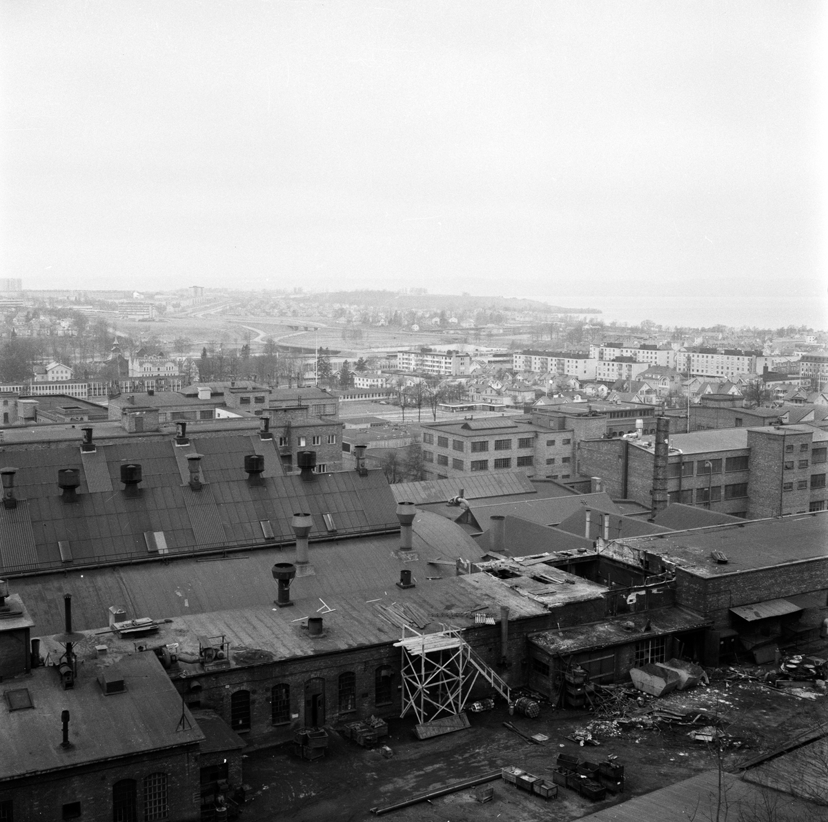 Vy över Huskvarna med delar av Husqvarna-fabriken i förgrunden.