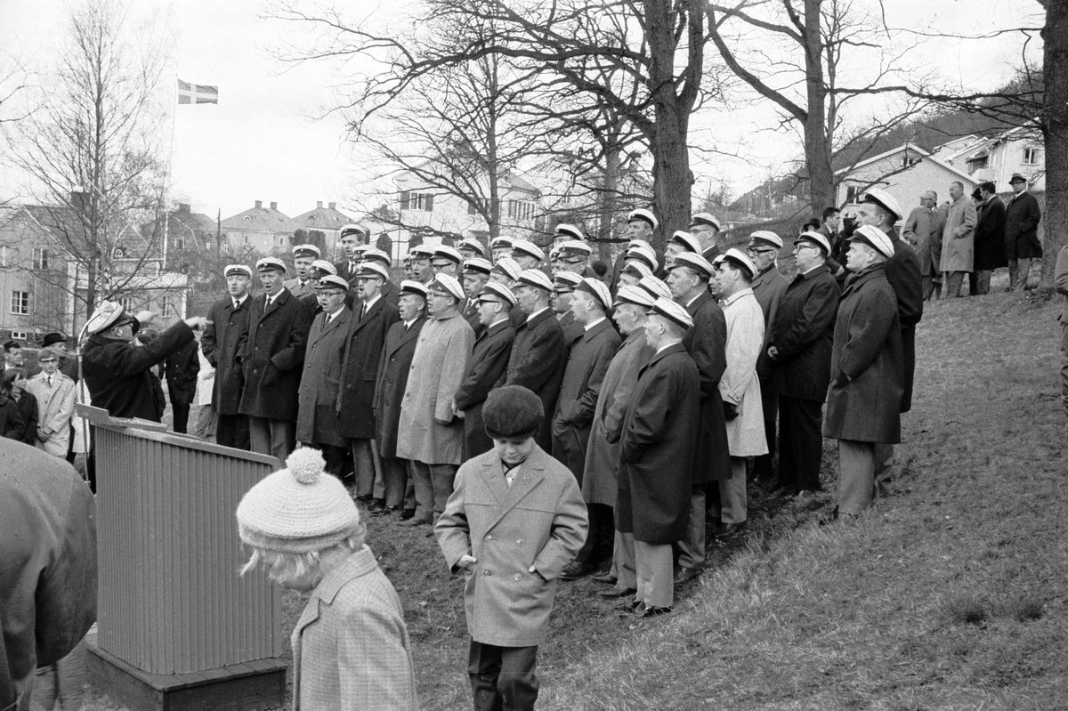 Första maj-firande i Huskvarna Stadspark och en kör iklädda studentmössor sjunger.