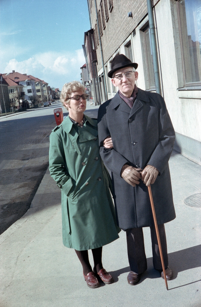 Ann Marie Larsson och hennes far Gustav Winnerfeldt står på en trottoar i Huskvarna.