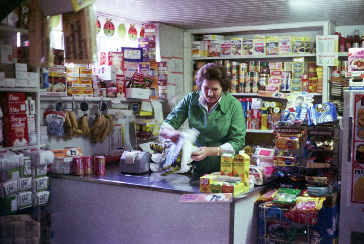 Bakom disken står fru Eriksson i affären "Mejericentralen" under Gustavs konditori på Vättergatan i Huskvarna.