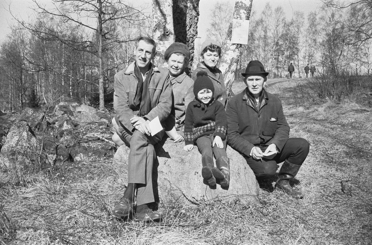 En solig vårdag kan det vara trevligt att gå på en tipspromenad. Pausar på en sten vid en tipsfråga gör Eivor Gunstedt (kvinnan till höger) och herr Gunstedt (mannen till höger).