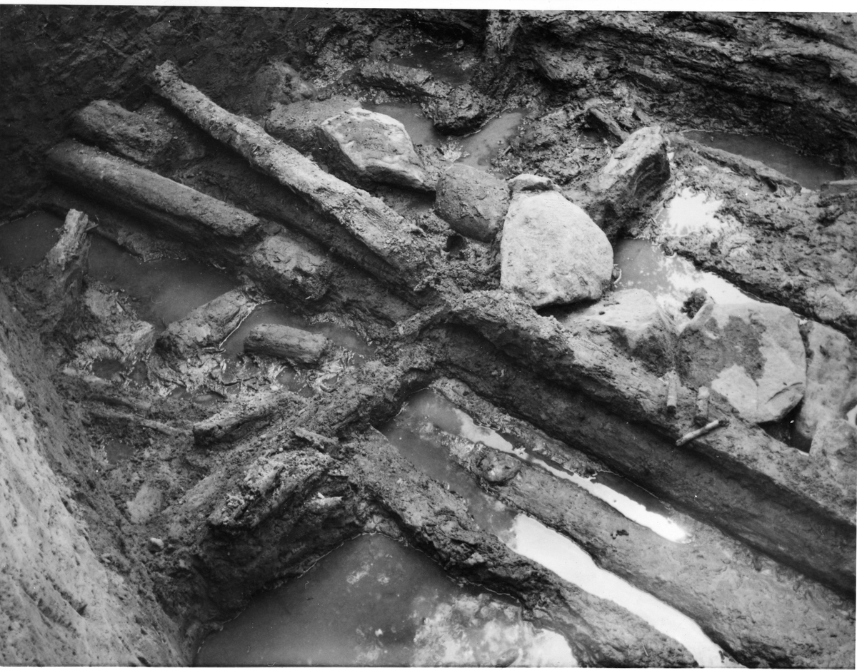 Närbild på timmer och stenar vid Rumlaborg i Huskvarna. Lämningarna påträffades i norra delen av schakt G på sydvästra sidan av borgkullen i samband med en arkeologisk undersökning sommaren 1942.