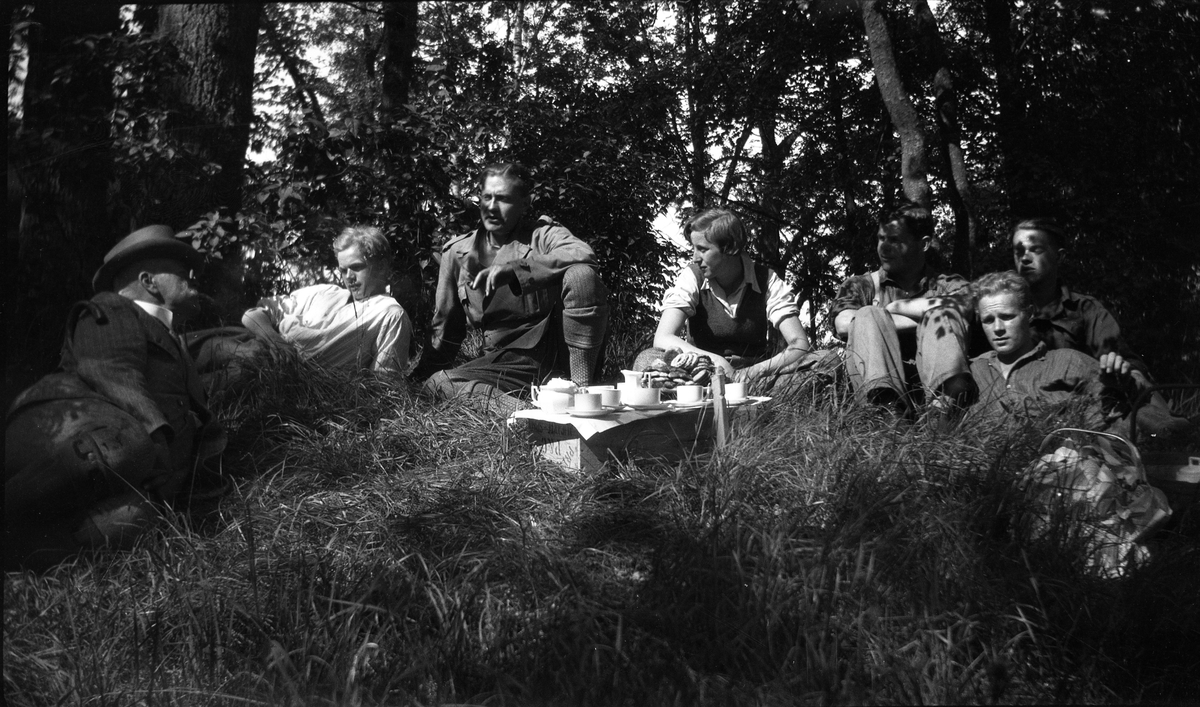 Kafferast i samband med de arkeologiska undersökningarna vid Rumlaborg i Huskvarna sommaren 1932. Med på bilden är, från vänster, Häradsfornvårdaren kapten Bror Kugelberg, Tord Andersson, Riksantikvarieämbetets utsände Erik o. Johanson, fröken Ingegerd Sjöberg, Walter Fredriksson, Martin Lindstedt och Anders Lindahl.