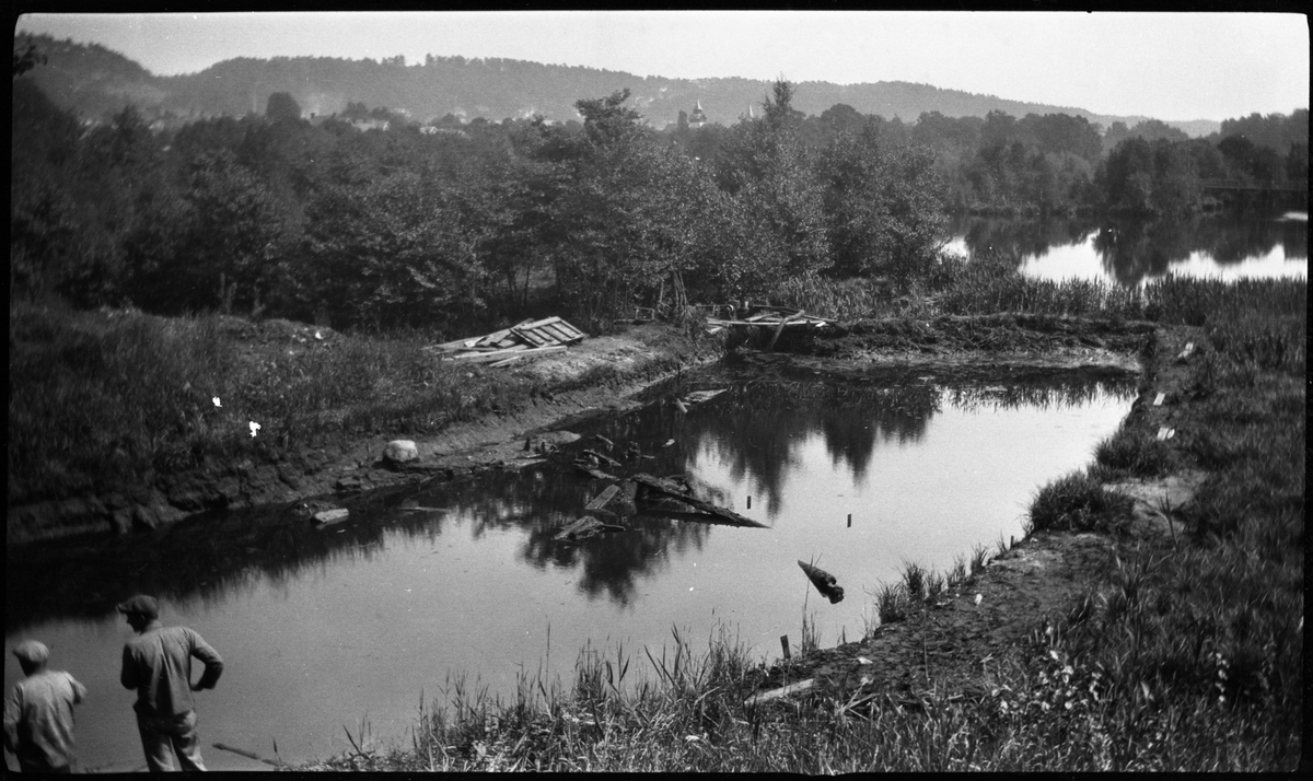 Två män står vid den inre vallgraven vid Rumlaborg i Huskvarna i samband med arkeologiska undersökningar sommaren 1935. Vattennivån i vallgraven är sänkt med hjälp av en pump och mot Huskvarnaån har en fördämning byggts. Centralt i bilden syns medeltida stockrester.