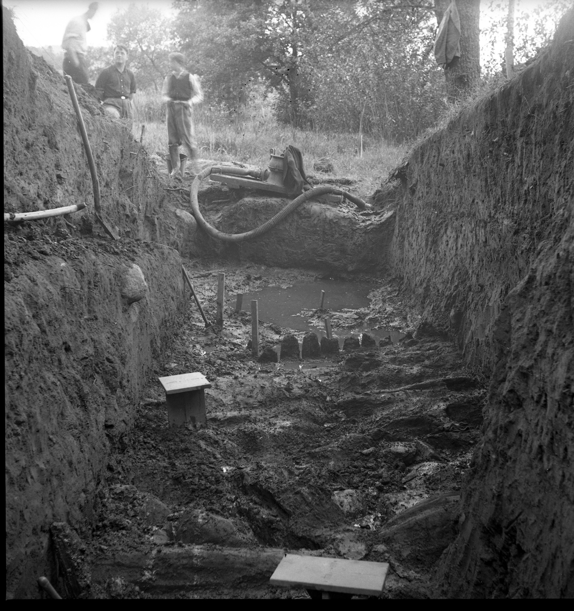 Schakt D genom den södra delen av borgkullen vid Rumlaborg i Huskvarna i samband med arkeologiska undersökningar sommaren 1938. Fotot är taget mot söder och i förgrunden kan stockrester ses, lite längre fram även rester av en pålrad. I bakgrunden står tre män, vid sidan av pumpen som användes för att hålla schaktet någorlunda torrt. Rester efter pålrader påträffades även vid andra delar längs med borgkullens kant i samband med de arkeologiska undersökningarna, som bedrevs av Huskvarna hembygdsförening mellan åren 1931-1942.