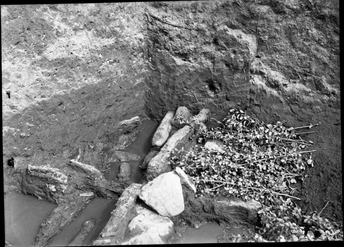 Timmer och stenar som framkommit i schakt G på sydsluttningen av borgkullen vid Rumlaborg i Huskvarna sommaren 1942. Utgrävningarna vid Rumlaborg bedrevs i Huskvarna hembygdsförenings regi nästan varje år mellan 1931 och 1942. Tidigare år hade strukturer som framkommit täckts med halm innan schakten fylldes igen men 1942 rådde foderbrist på grund av kriget. Därför täcktes anläggningarna med ett lager av grenar och smala stammar av gråal.