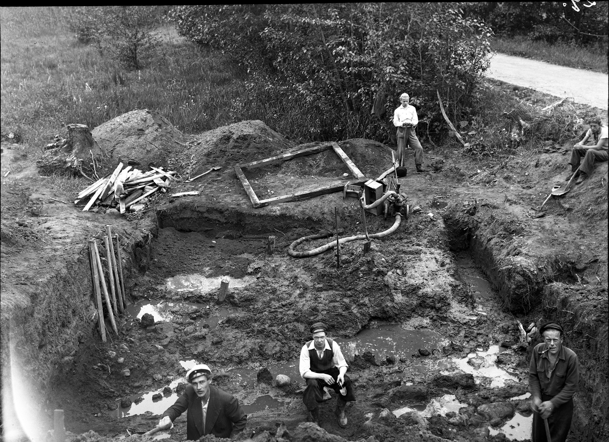 Utgrävning av schakt G på och nedanför den sydvästra sluttningen av borgkullen vid Rumlaborg i Huskvarna är i full gång. Tvärs över schaket syns en rad med pålar. Huskvarna hembygdsförening bedrev utgrävningar vid borgen mellan åren 1931 och 1942 och vid de olika undersökningarna framkom rester efter pålrader på flera platser längs med borgkullens sidor. Pumpen vid schaktets bortre kant behövdes för att pumpa bort inträngande vatten från schaktet. Det var en handdriven diafragmapump inlånad från Huskvarna stad. Närmast till vänster i bild finns projektledaren Georg Sahlströms närmaste man, fil. kand. Gunnar Hellman i studentmössa. Övriga deltagare var elever från Huskvarna samrealskola samt Jönköpings högre allmänna läroverk, samt en arbetare från Huskvarna stad.