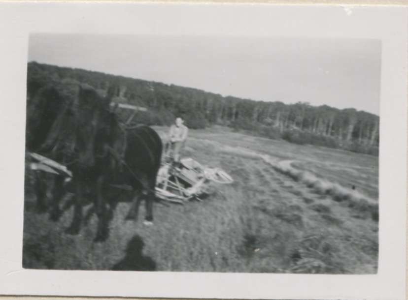 En man sitter och kör ett åkredskap med hjälp av två arbetshästar, "Sandbergs" Sagered 3:3 1940-tal.