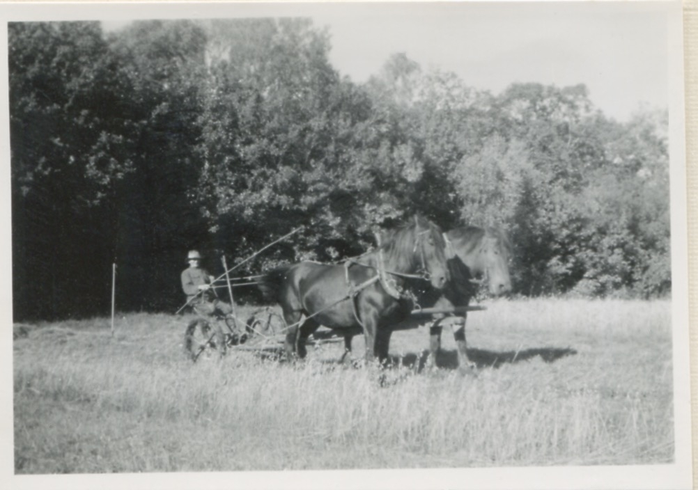 Robert Sandberg (1880-1961) kör slåttermaskin med hjälp av två arbetshästar, nedanför Kalvhagen "Sandbergs" Sagered 3:3 1940-tal.