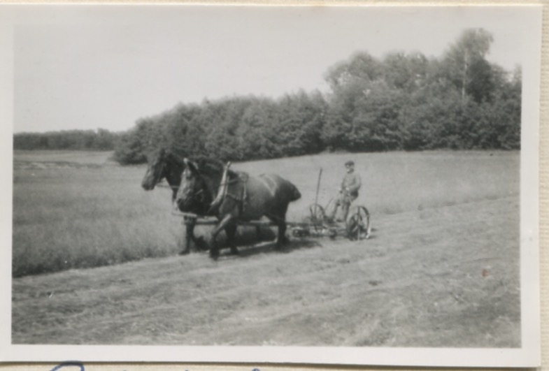 Robert Sandberg (1880-1961) kör slåttermaskinen med hjälp av två arbetshästar, "Sandbergs" Sagered 3:3 1940-tal.