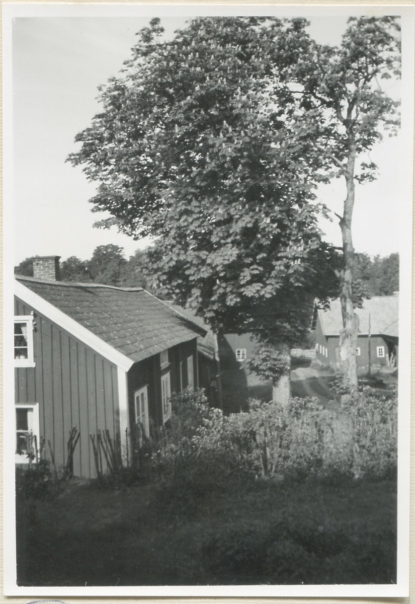 Till vänster ses flygelbyggnaden vid Sagered 3:3 cirka 1955. Stugan innehöll bland annat brygghus och två lägenheter för sommargäster. Troligen byggd under 1700-talet.