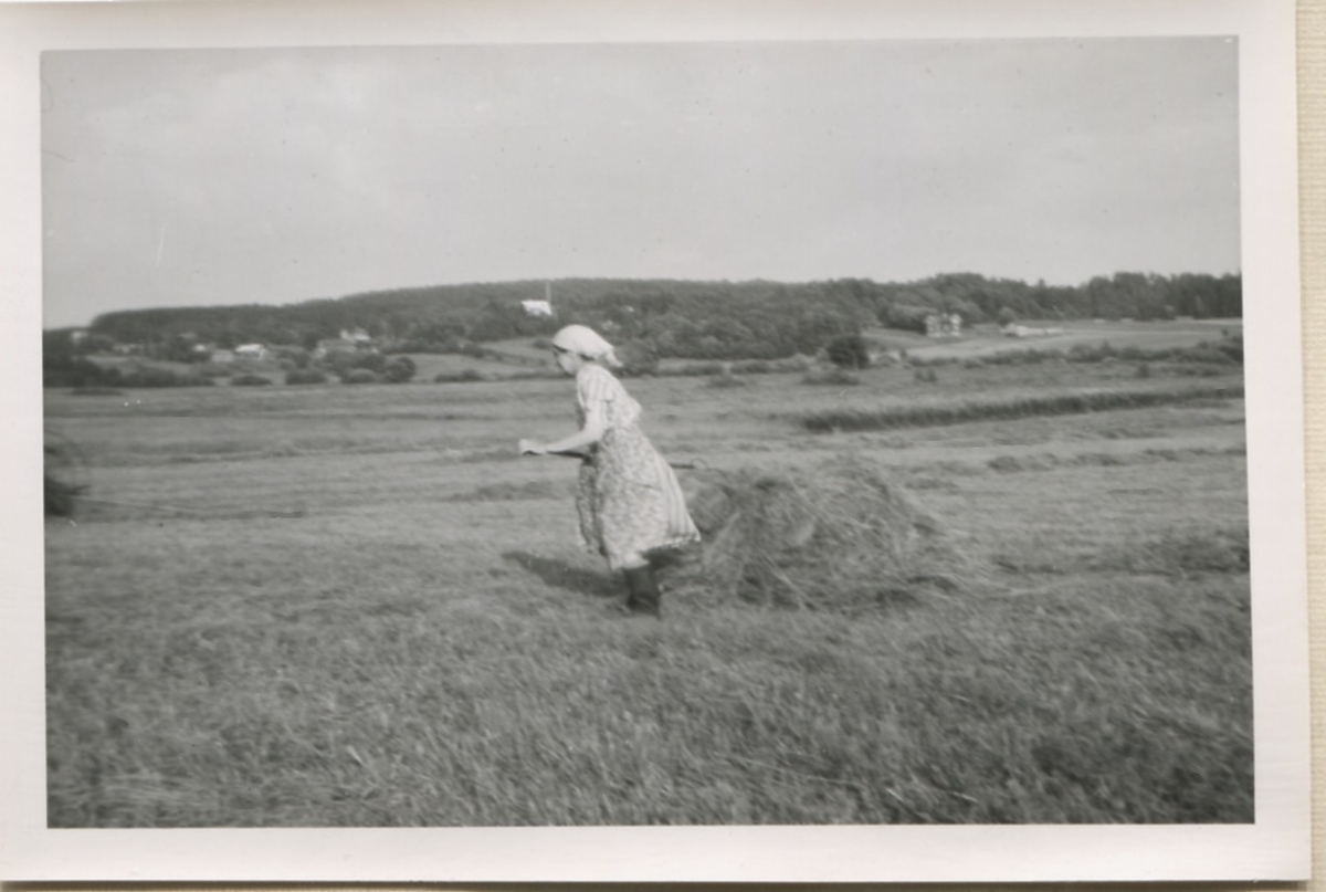 Hilda Sandberg (1887-1973) arbetar med höbärgning på åkern, "Sandbergs" Sagered 3:3 år 1954.